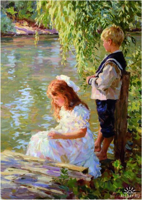 и полощет косами в воде,